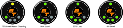 The lower set, denoted as the “Level LED’s,” indicate the approximate soot load index (SLI) by displaying in percent the number of passages that remain open as the filter accumulates PM. The SLI calculation is achieved by programming each unit with the application’s engine displacement and filter size. Doing so allows the software to utilize its built in algorithm for predicting PM loading. Because regeneration is not controlled in a passive system, the Backtraker’s™ SLI offers the advantage of forecasting service and maintenance needs before engine backpressure rises to levels that may cause internal damage to the filter.